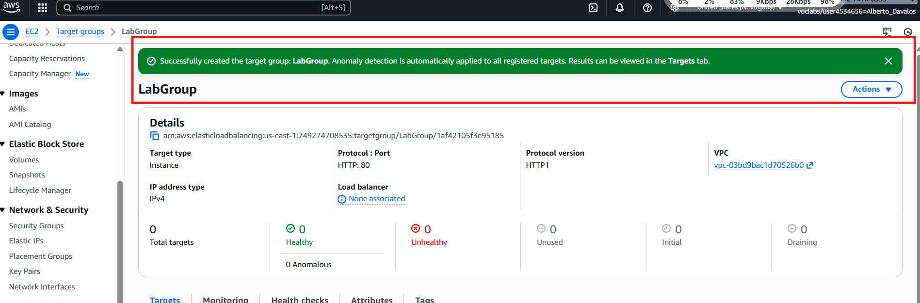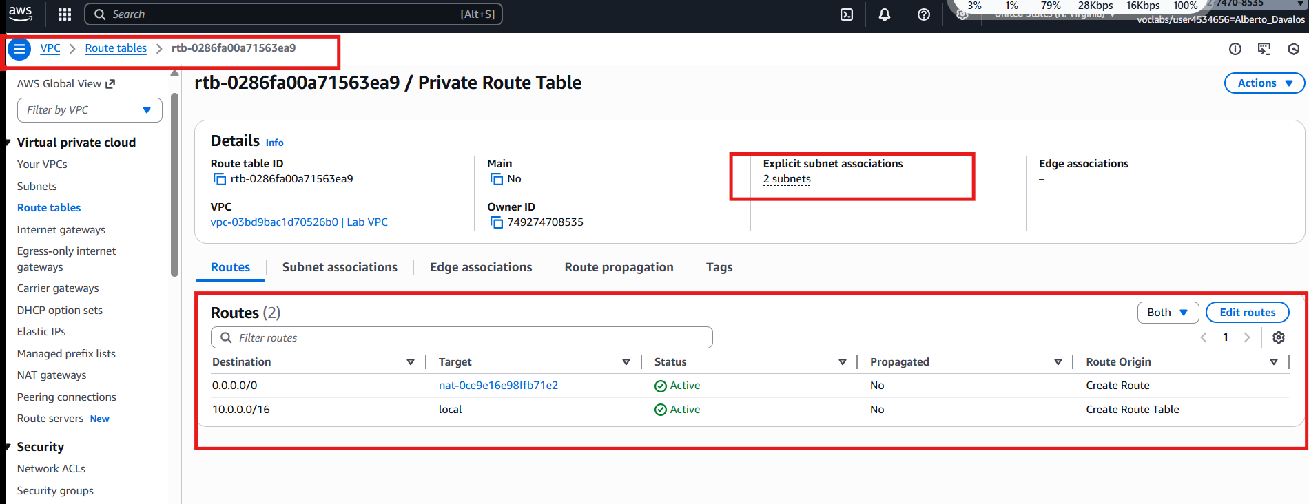 La VPC de laboratorio(Lab VPC) con sus subredes en dos AZ (públicas para el ALB y privadas para las instancias del ASG), pasarela asociada y tablas de rutas aplicadas.