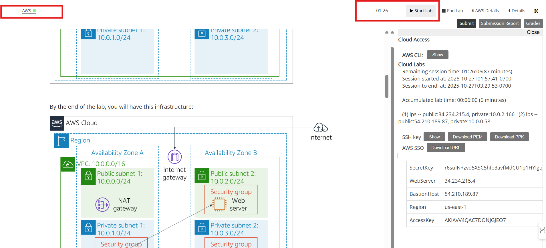 El lab iniciado con el temporizador activo y el enlace AWS habilitado.