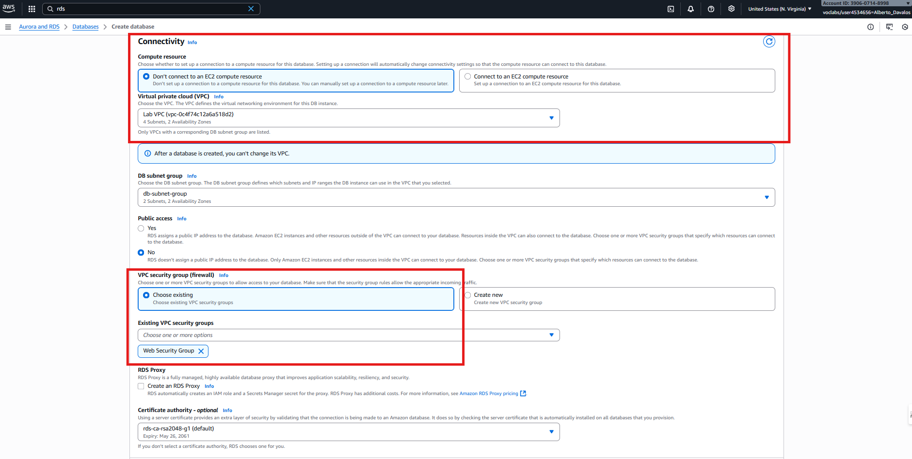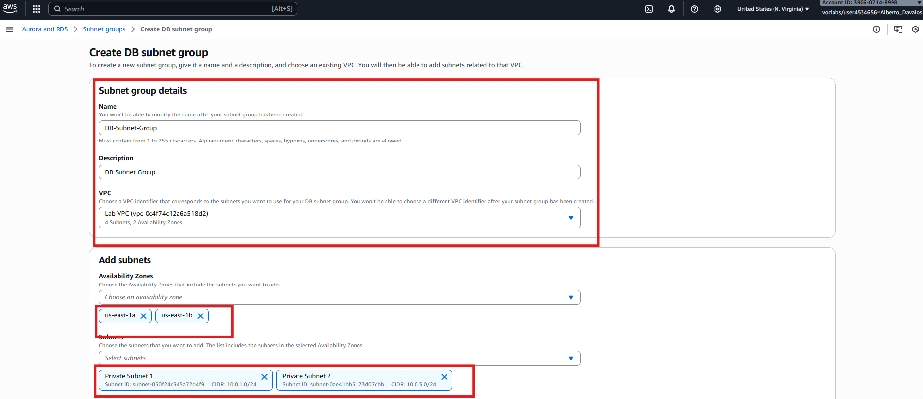 RDS —> Subnet groups —> Create DB Subnet Group y añadir subredes de Lab VPC.