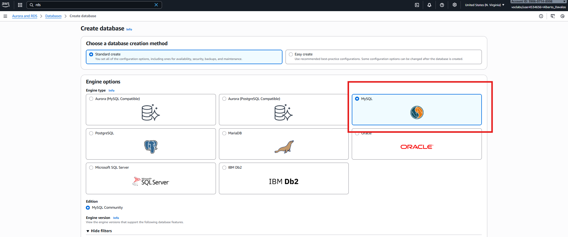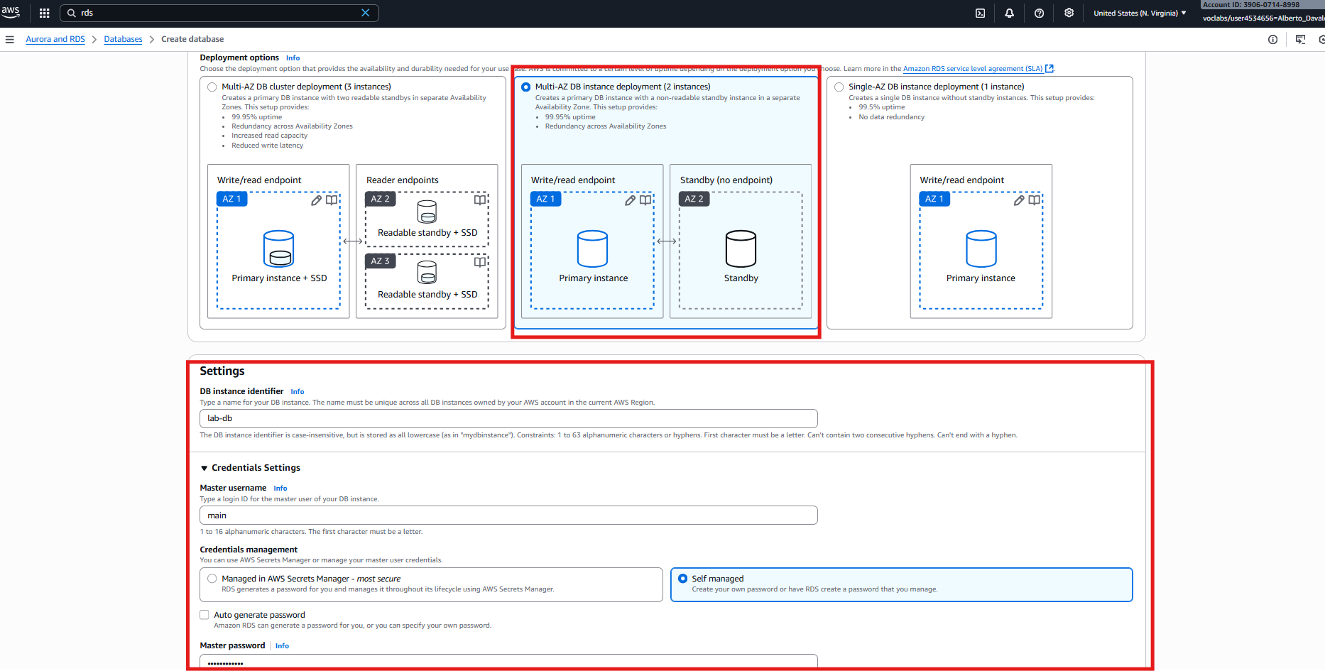 Configuración de lab-db como MySQL Multi-AZ con plantilla Dev/Test.