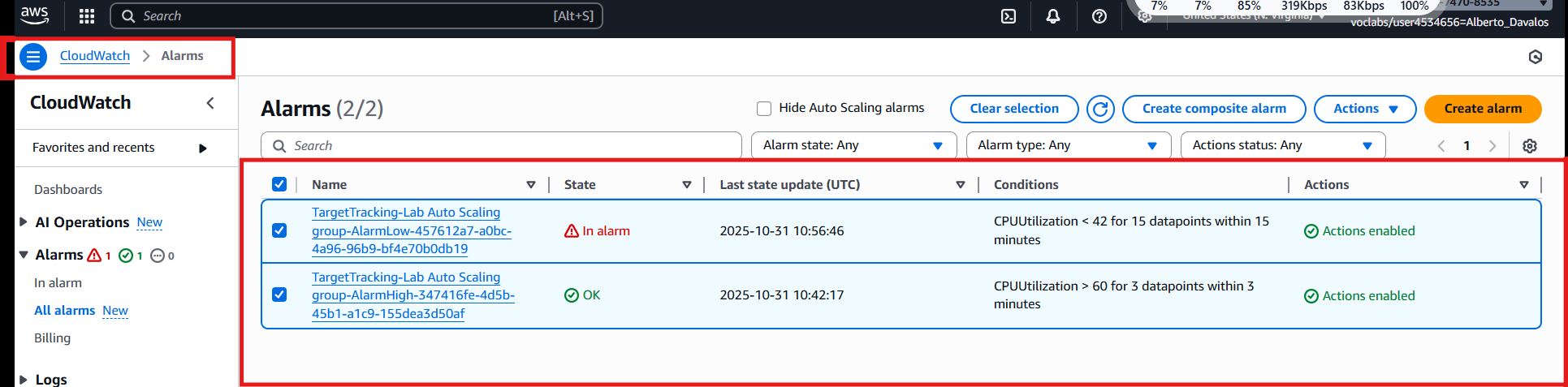 En la consola CloudWatch → Alarms se observan las dos alarmas generadas automáticamente por la política de Target tracking del ASG: