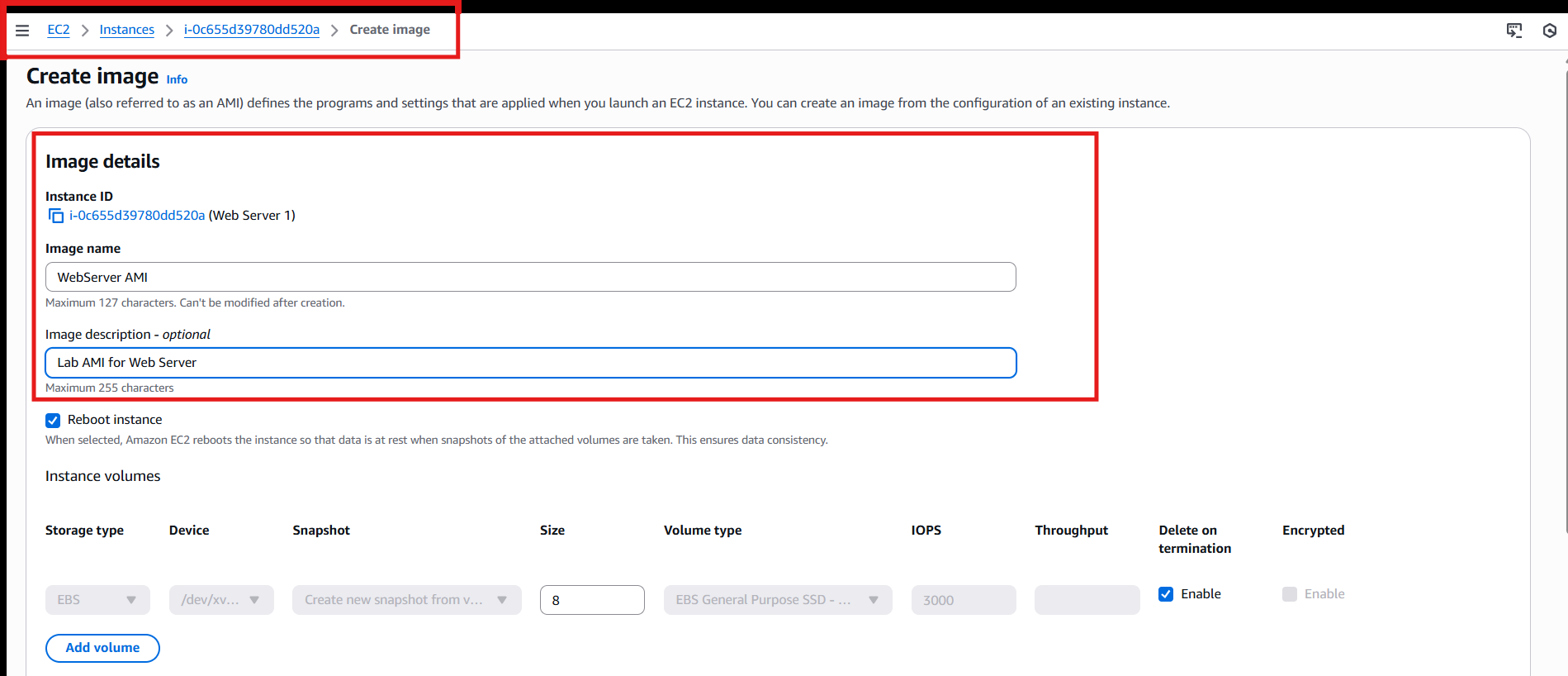 Nombre: Lab AMI (o el usado) → dejar root volume por defecto → Create image.