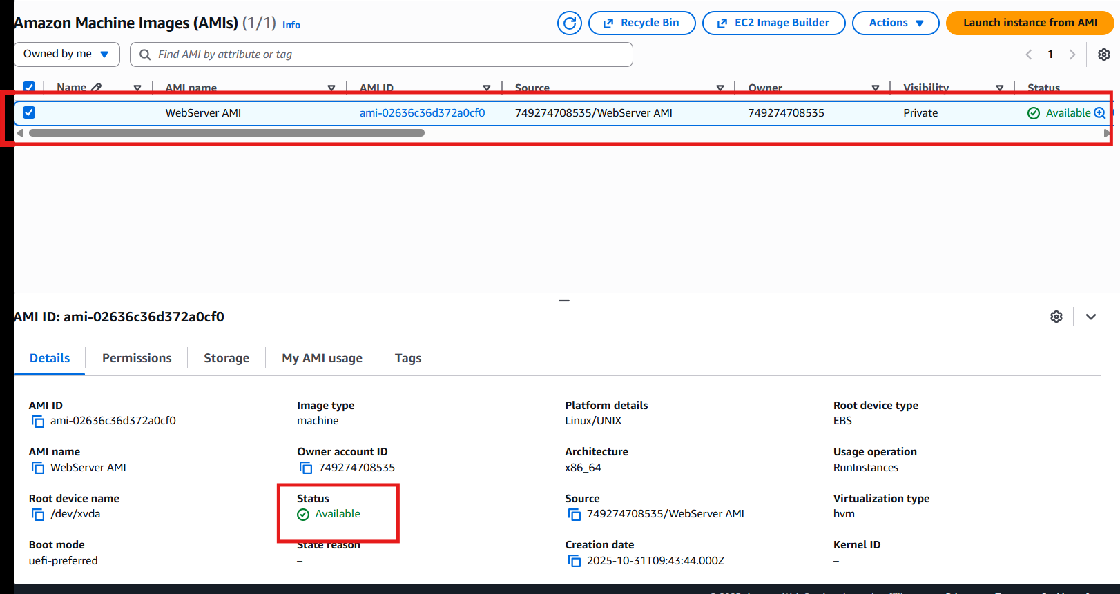 Imagen de la AMI creada a partir del servidor web base (Web Server), con su AMI ID, nombre y Estado: available