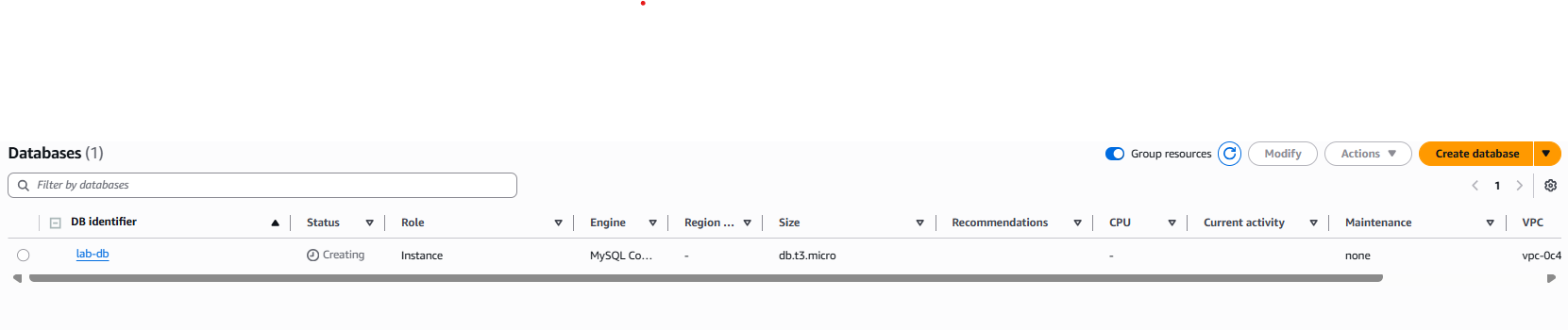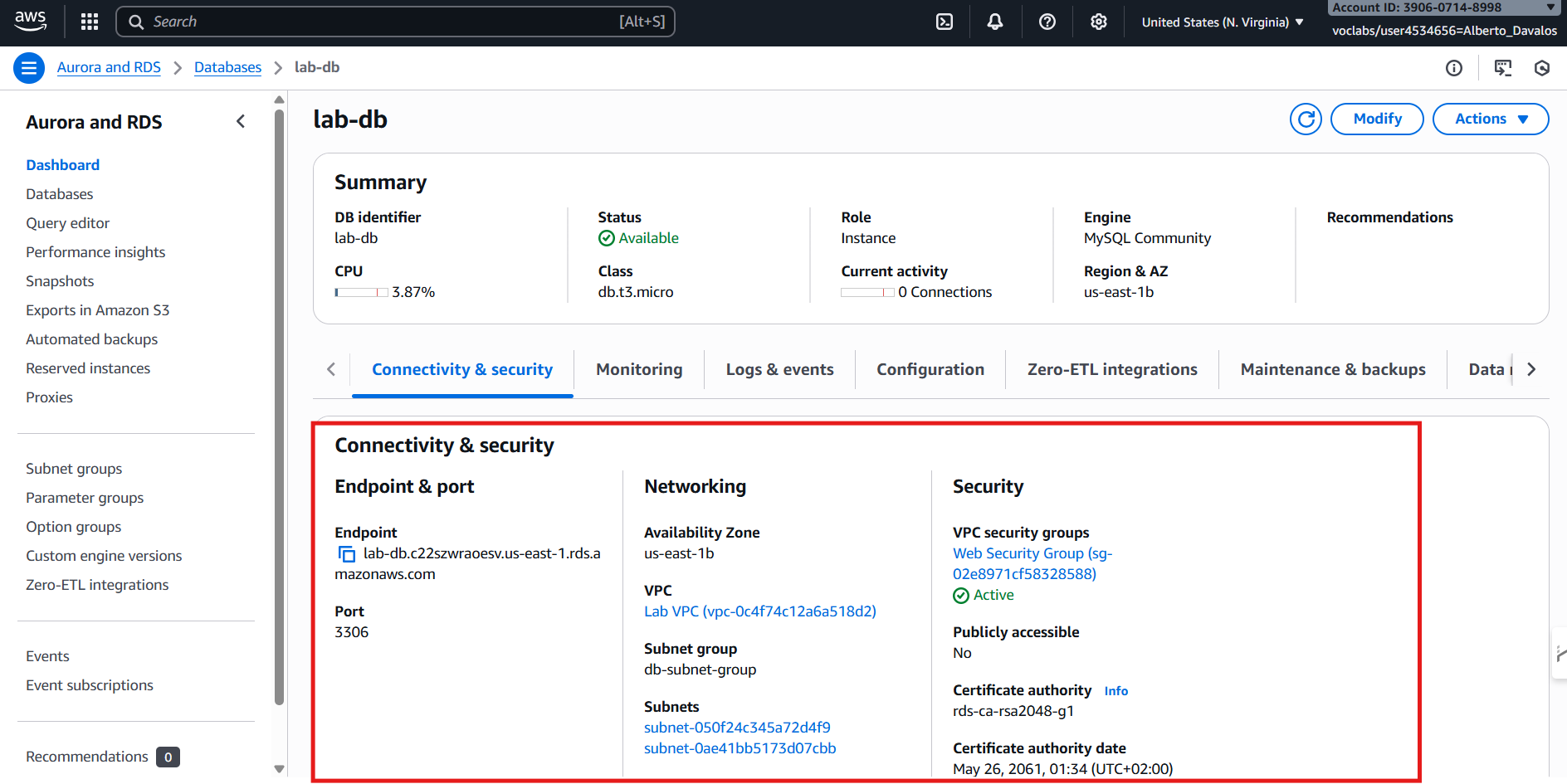 lab-dbstatus Available y el Endpoint copiado. Cómo se hizo: