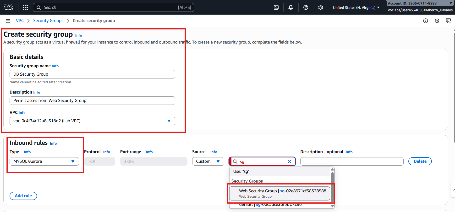 Cambio a DB Security Group adjunto a lab-db, inbound MySQL 3306 desde Web Security Group.