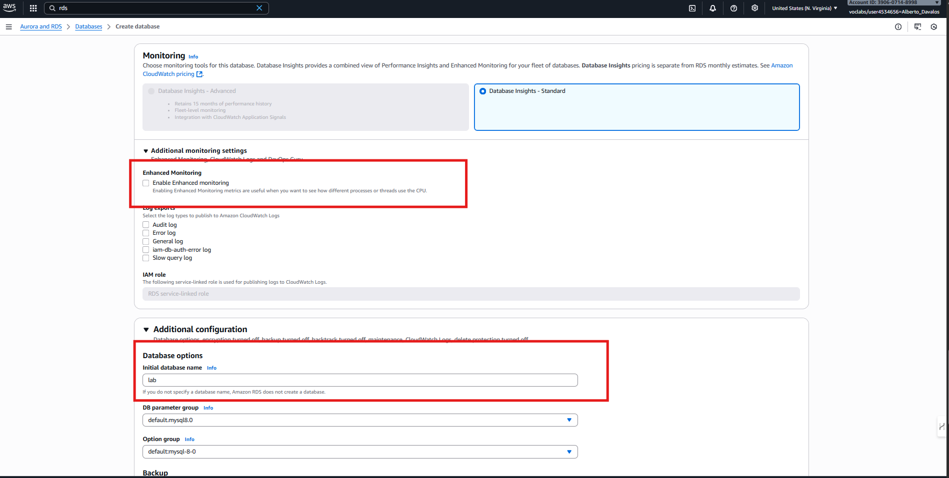 Configuración de lab-db como MySQL Multi-AZ con plantilla Dev/Test.